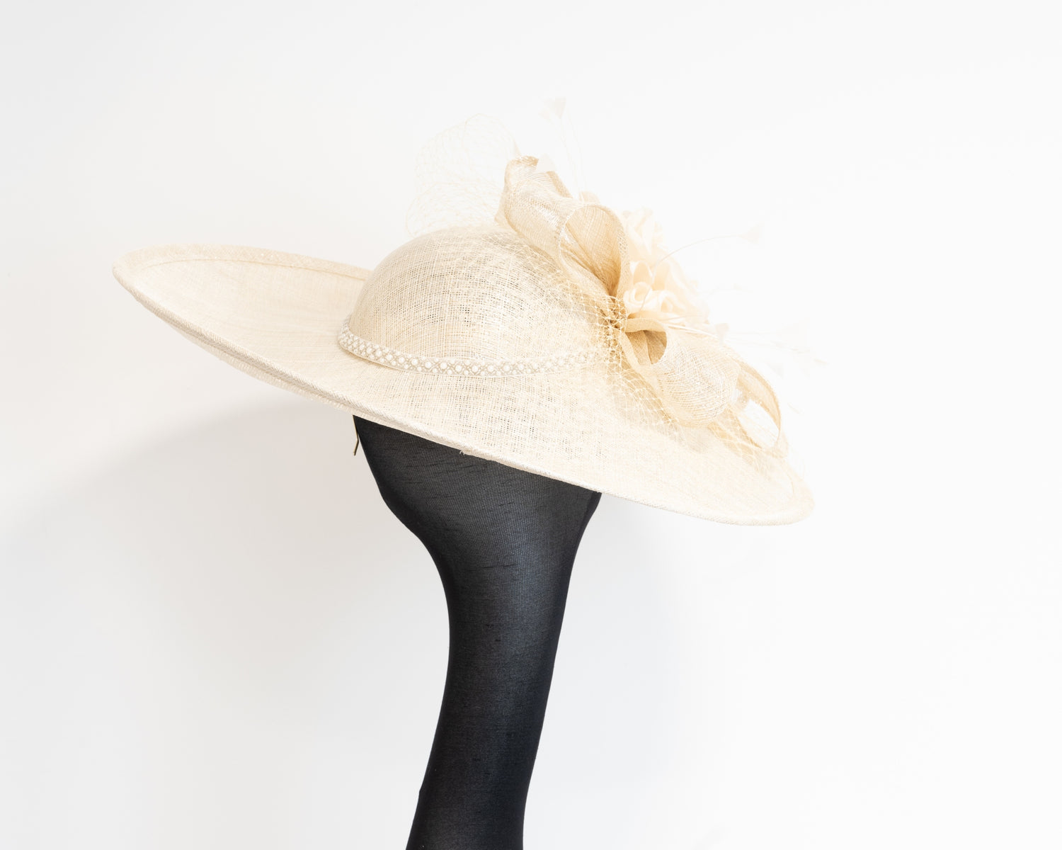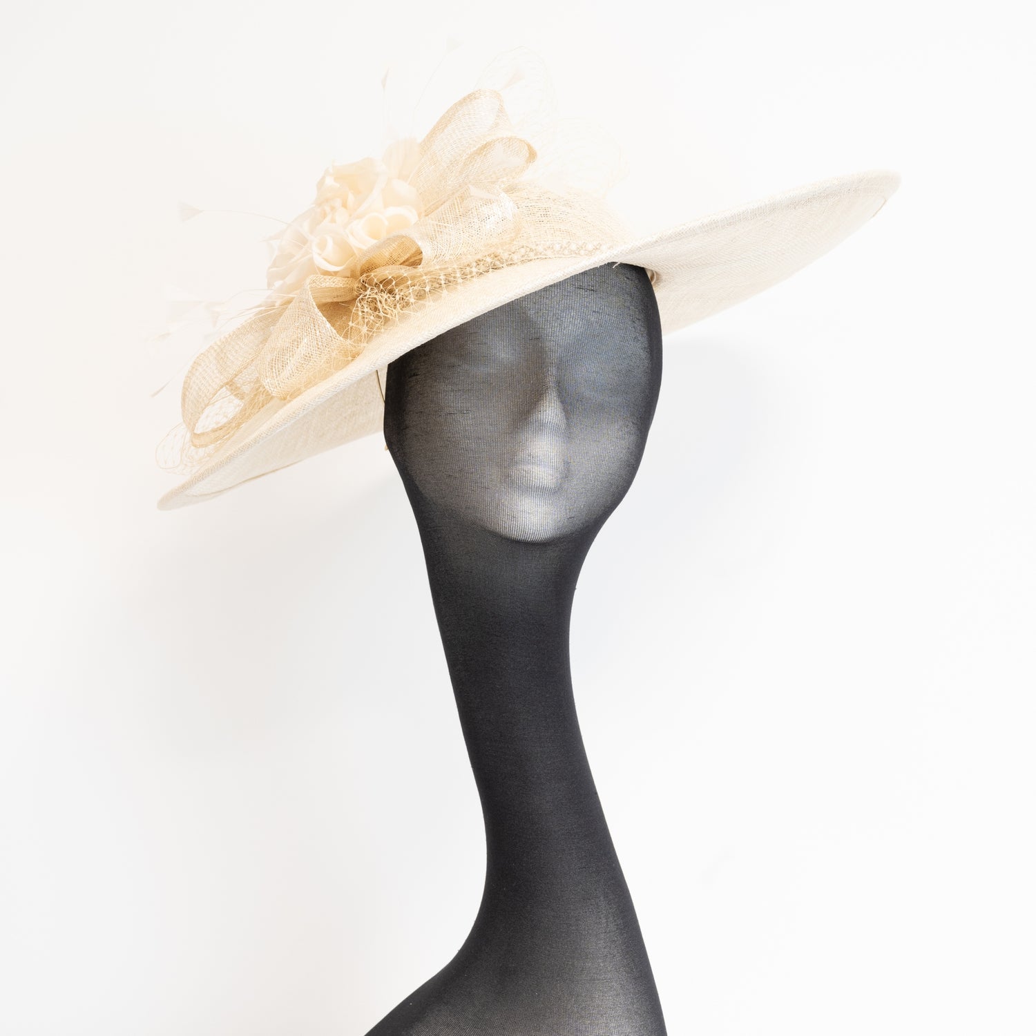 Our Angela hat had been created out of cream sinamay with a silver lurex thread to offer a unique lustre and shimmer.