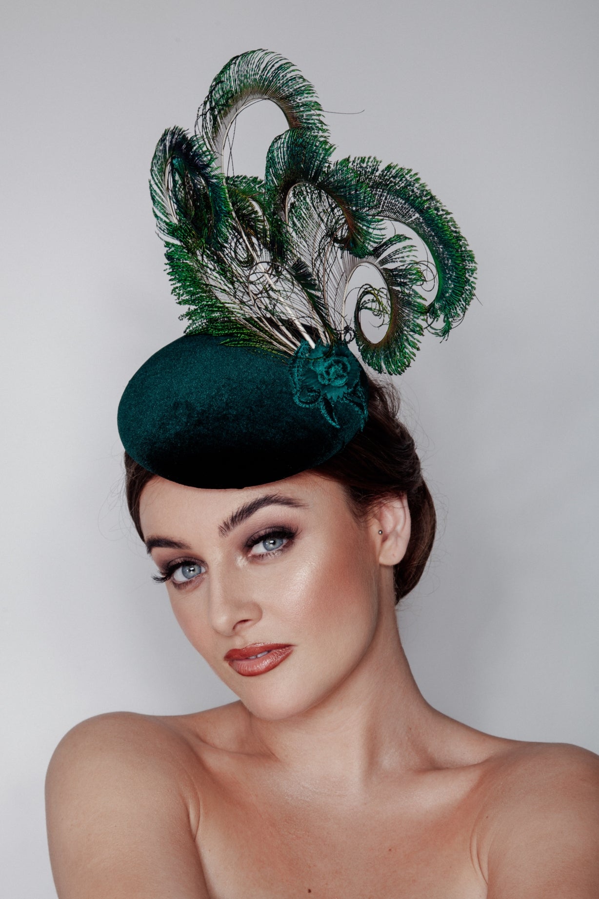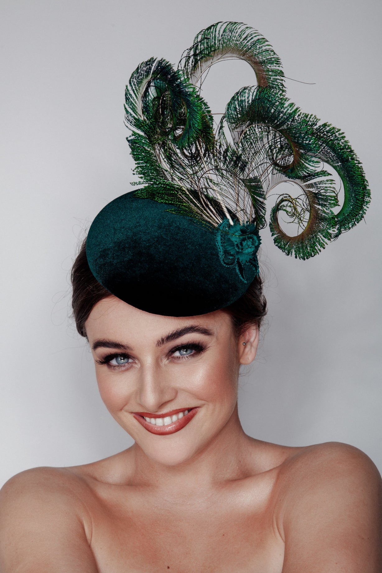 Our opulent green velvet pillbox is trimmed with peacock feathers for a distinctive look.