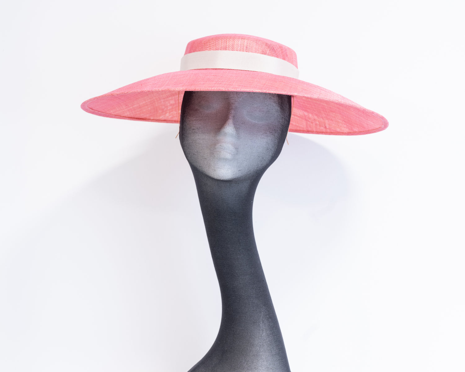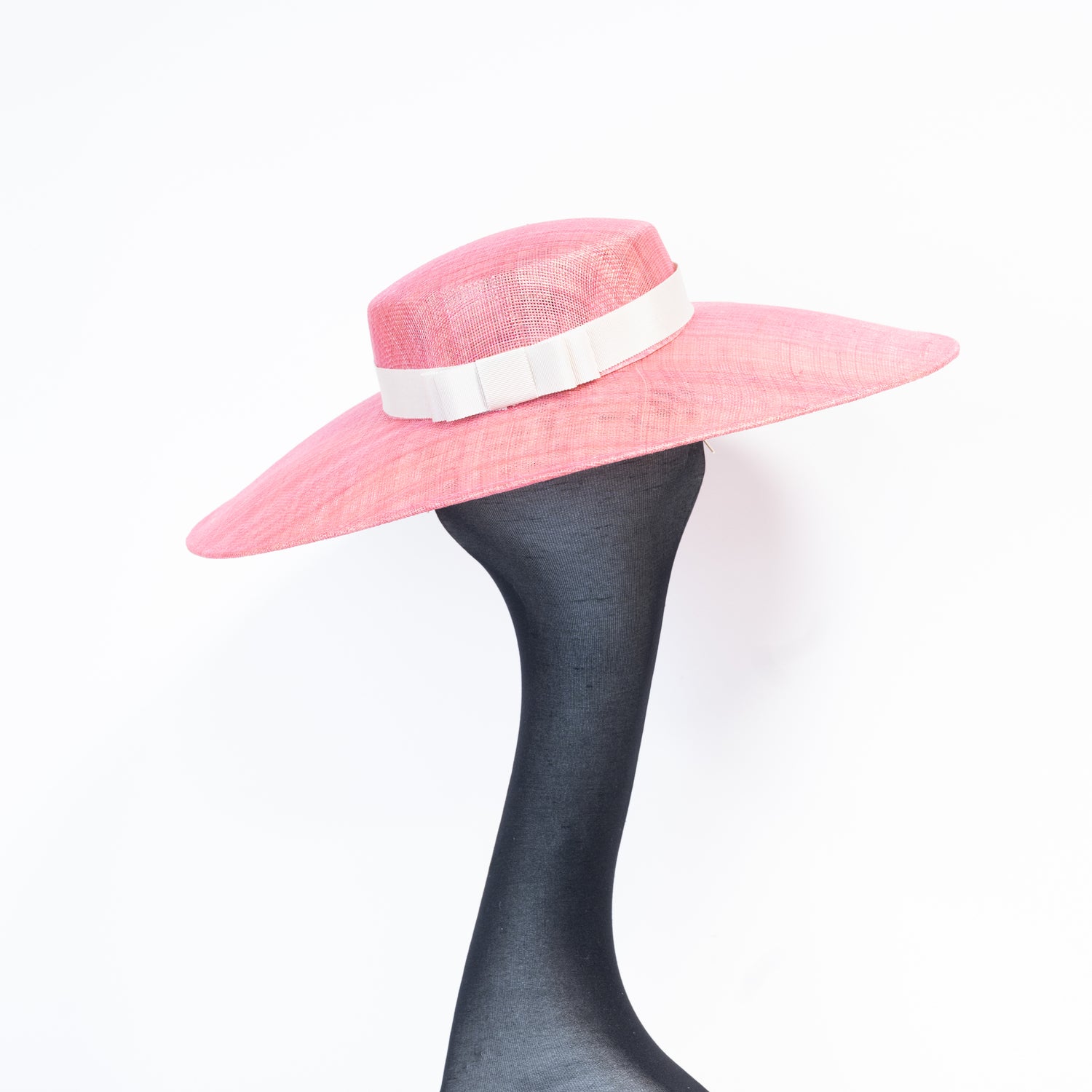 Our Sarah down-rimmed hat is created in a stunning shade of raspberry sinamay. We have trimmed it with a natural tone Petersham to add definition.