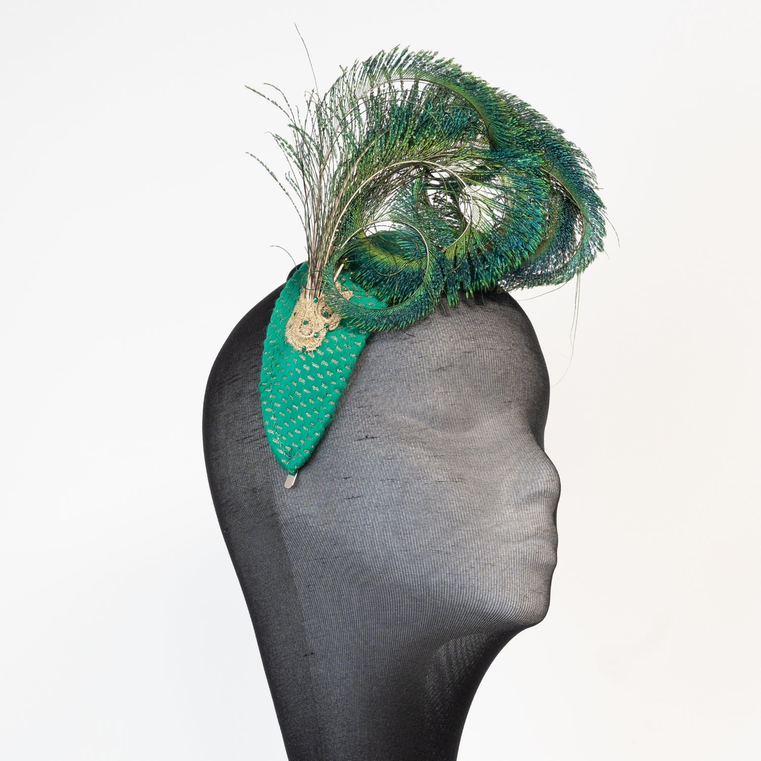 We have used a plush green and gold brocade fabric to create out Una hairband. We have trimmed it with peacock feathers to add a unique lustre to this piece.